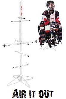 $59 on Amazon or get the smaller metal rack for cheaper- Hockey Equipment Drying Rack – These racks sell for about $50 a piece and are good to tuck in your furnace room or garage and hang your equipment on. If you use one of these in a room without much air circulation I would recommend turning a fan on for about an hour to help dry the stuff out a bit faster.