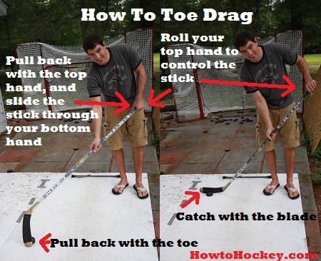 In my article and video on how to stickhandle I mention that to be master of the puck, you need to be able to control the puck around your entire body, and also have the ability to move the puck from side to side, and front to back in any situation. Perfecting the toe drag will give you the ability to move the puck quickly backwards and forwards, and side to side no matter where it is.