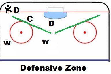 - Notice D1 and D2 are both inside the dots (faceoff dot markings on the ice) to force opponents to the outside