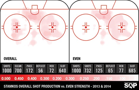 Let’s take a look at 1000 of Steven Stamkos’s shots from 2013, and 2014. While they mostly exist in the high percentage scoring area, or home plate area, you can see that Stamkos is actually shooting from many different spots, especially on the “overall” part of the chart. Varying distances, varying angles, and varying degrees of difficulty for the former 60 goal scorer.